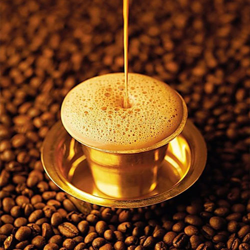 A strong and aromatic South Indian coffee made by brewing finely ground coffee beans in a traditional metal filter, then mixed with hot frothy milk and served in a stainless steel