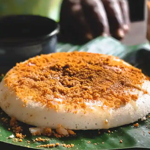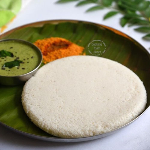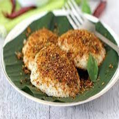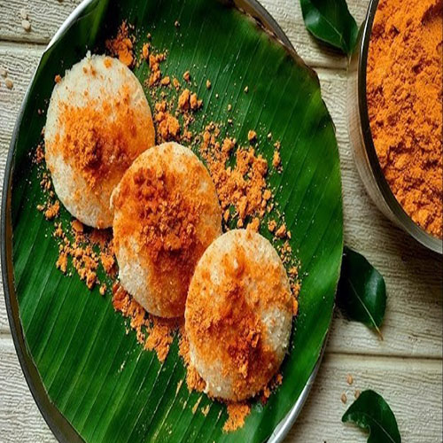 Plate-sized steamed rice cakes with a soft and fluffy texture, topped with house special spicy powder, offering a flavorful and satisfying twist on the traditional idly