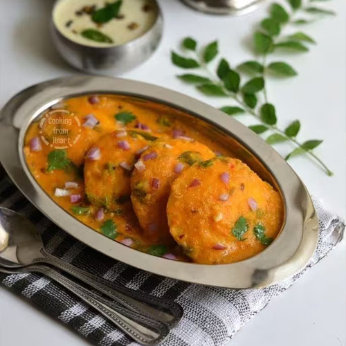 Treat yourself to the comforting delight of Sambar Idly—soft, pillowy idlis soaked in flavorful, aromatic sambar brimming with spices and tender vegetables. Each bite is a perfec