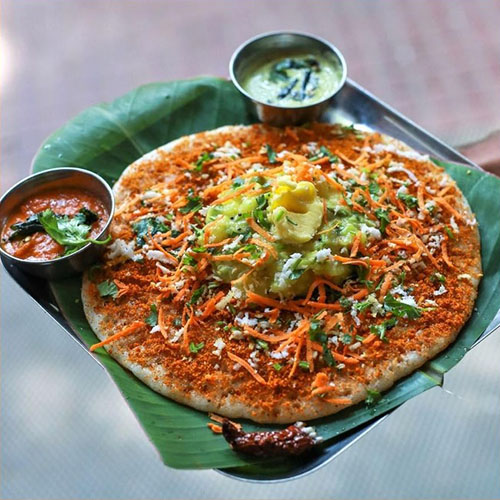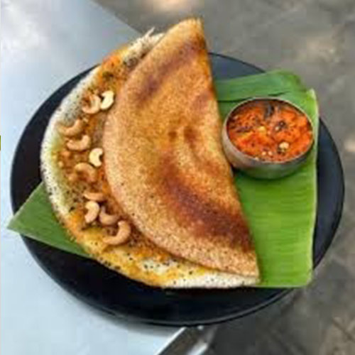 A decadent South Indian dosa made with a flavorful blend of cashew nuts and ghee, topped with house special paste, offering a rich and indulgent taste thats perfect for a special o