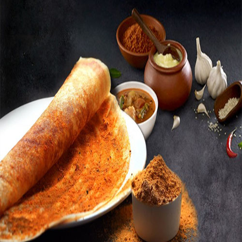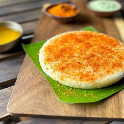 A savory South Indian dosa flavored with spicy garlic (velluli) paste, house psecial paste and cooked with aromatic ghee, offering a delightful combination of bold flavors and rich