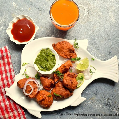 Deep-fried fritters made from a batter of chickpea flour and spices, with chunks of fish mixed in, creating a crispy and flavorful snack popular in Indian cuisine