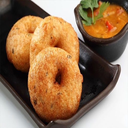 A South Indian savory snack made from a batter of ground lentils and spices, shaped into small rounds or doughnuts, and deep-fried until golden and crispy, offering a deliciously c