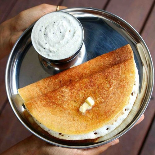 A classic South Indian dosa made with a generous amount of butter, offering a rich and indulgent flavor with a crispy texture, perfect for enjoying on its own or with your favorite