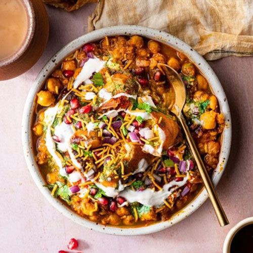 Crispy samosas broken into bite-sized pieces and topped with tangy tamarind chutney, spicy green chutney, yogurt, chopped onions, tomatoes, and a sprinkle of chaat masala, creating