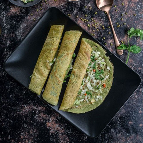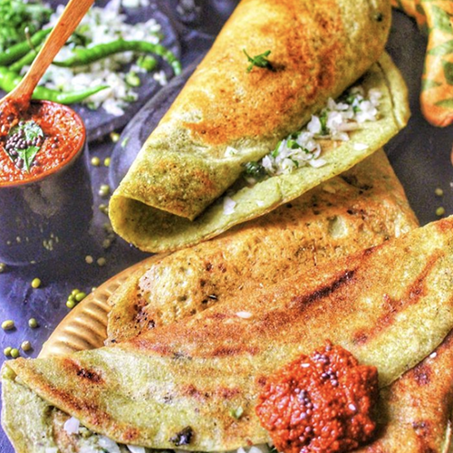 A savory South Indian crepe made from green gram lentils and seasoned with a flavorful masala mixture, typically consisting of onions, green chilies, cumin seeds, and cilantro, off
